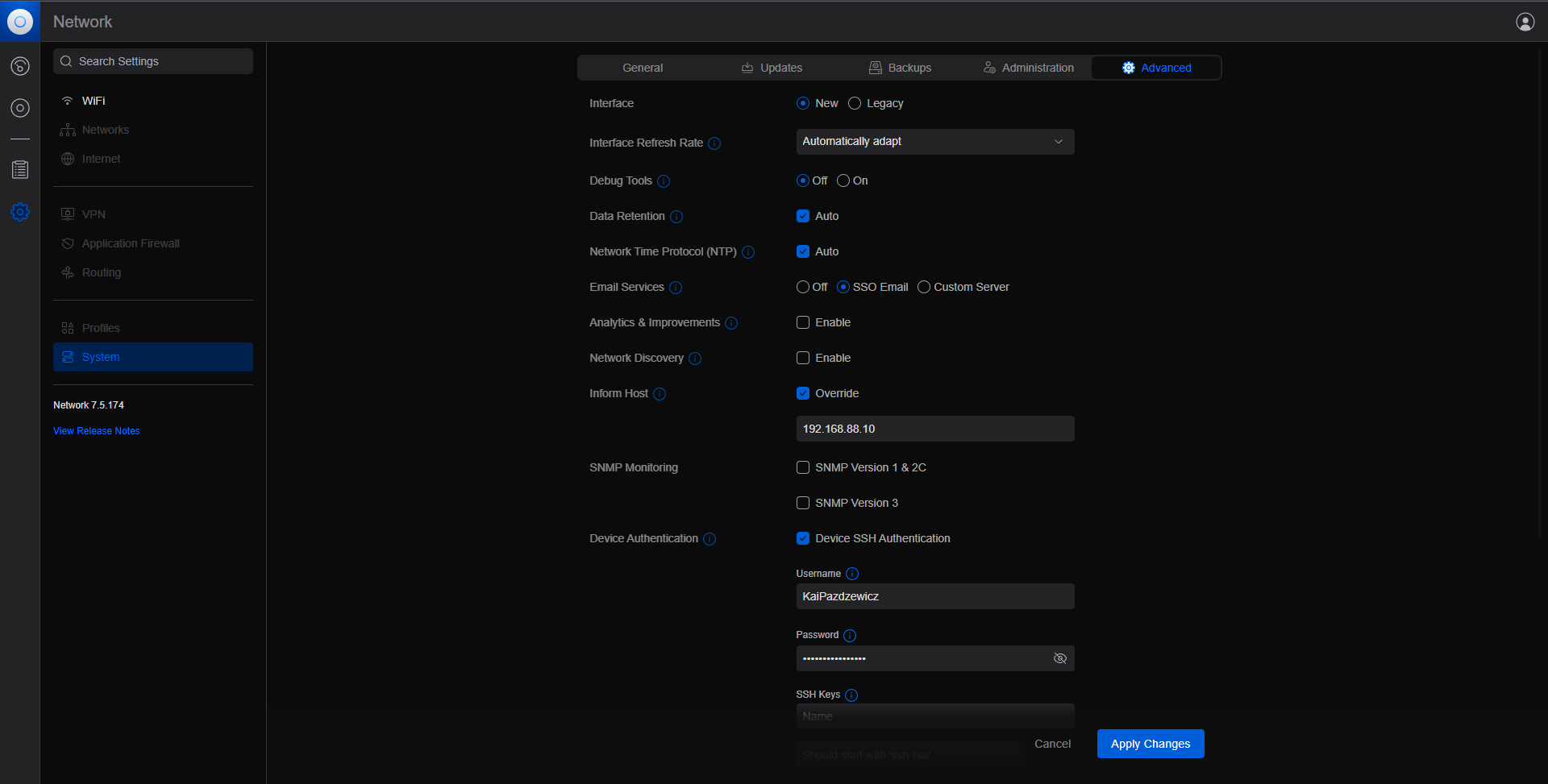 Sie können dies in den Einstellungen unter Settings -> System -> Advanced -> Inform Host durchführen. Aktivieren Sie die Option Override und geben Sie die IP-Adresse des Docker-Hosts ein. In diesem Beispiel verwenden wir die IP-Adresse 192.168.88.7.
